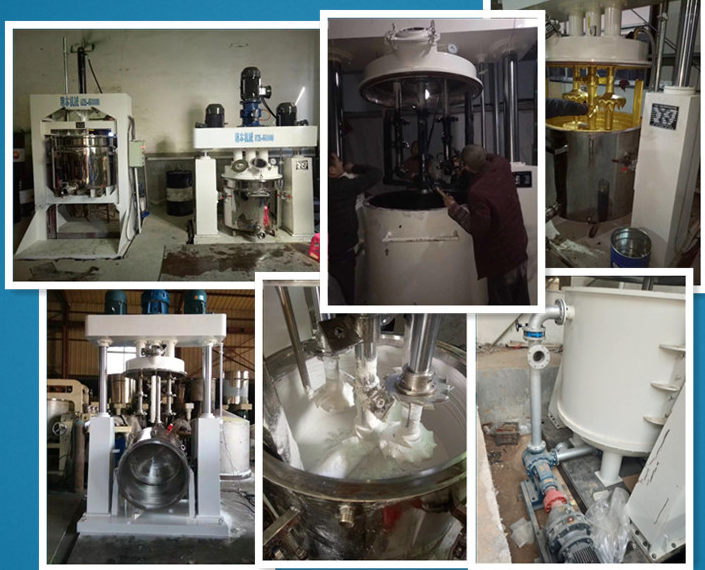 是一種多功能、強制性攪拌機,釜內有三根不同形式的攪拌器,其中一根低速攪拌器在繞釜體軸線轉動,其余兩根高速攪拌裝置又以不同的轉速繞自身軸線高速自轉,使物料在釜內作復雜的運動,受到強烈的剪切和混合。設備內山形刮壁刀繞釜體軸線轉動,將粘在壁上和底部的原料刮出參與混合,使其效果更為理想。設備密封性好,可電加熱(水冷卻)抽真空,具有良好的排氣除泡。強力分散機缸蓋可液壓升降,缸體可自由移動,操作十分方便。強力分散機攪拌器的形式,根據物料要求可為多層槳葉式、框式、蝴蝶式、葉輪式等。攪拌機通常配套系列液壓擠出機,以實現(xiàn)膏狀物料的擠出。